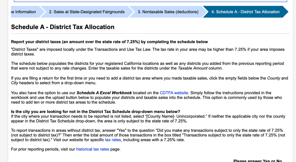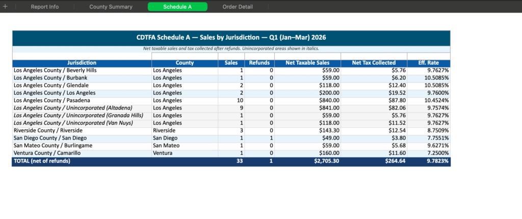 California sales tax filing requires more than a single statewide number. CDTFA’s Schedule A asks you to break down your taxable sales and tax collected by jurisdiction — county by county, city by city. For WooCommerce store owners filing manually, that means digging through orders, sorting by shipping address, and tallying numbers by hand every quarter. It’s tedious, error-prone, and eats up time you don’t have right before a filing deadline.